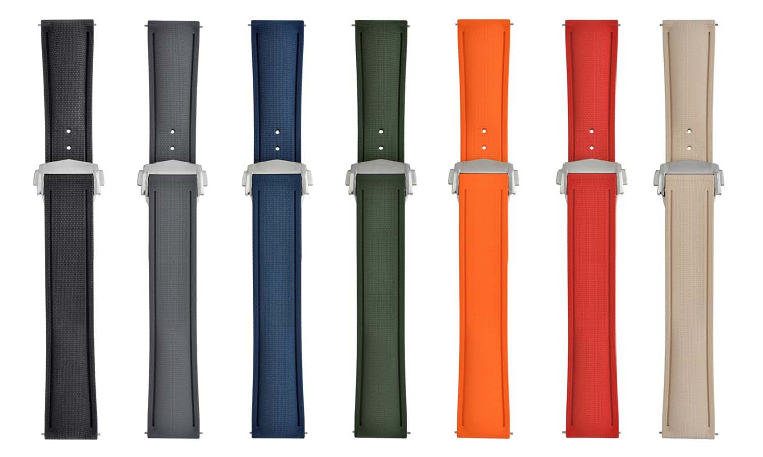 The Premium Flexible FKM straps are available in 20mm, 21mm, and 22mm widths, covering a wide range of popular watches.